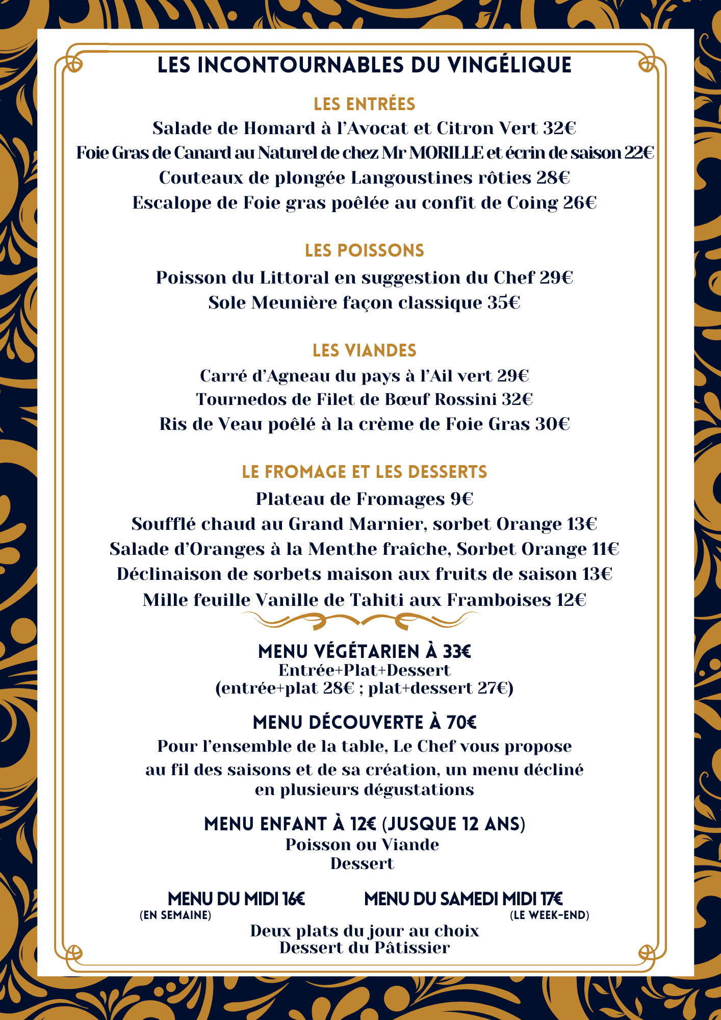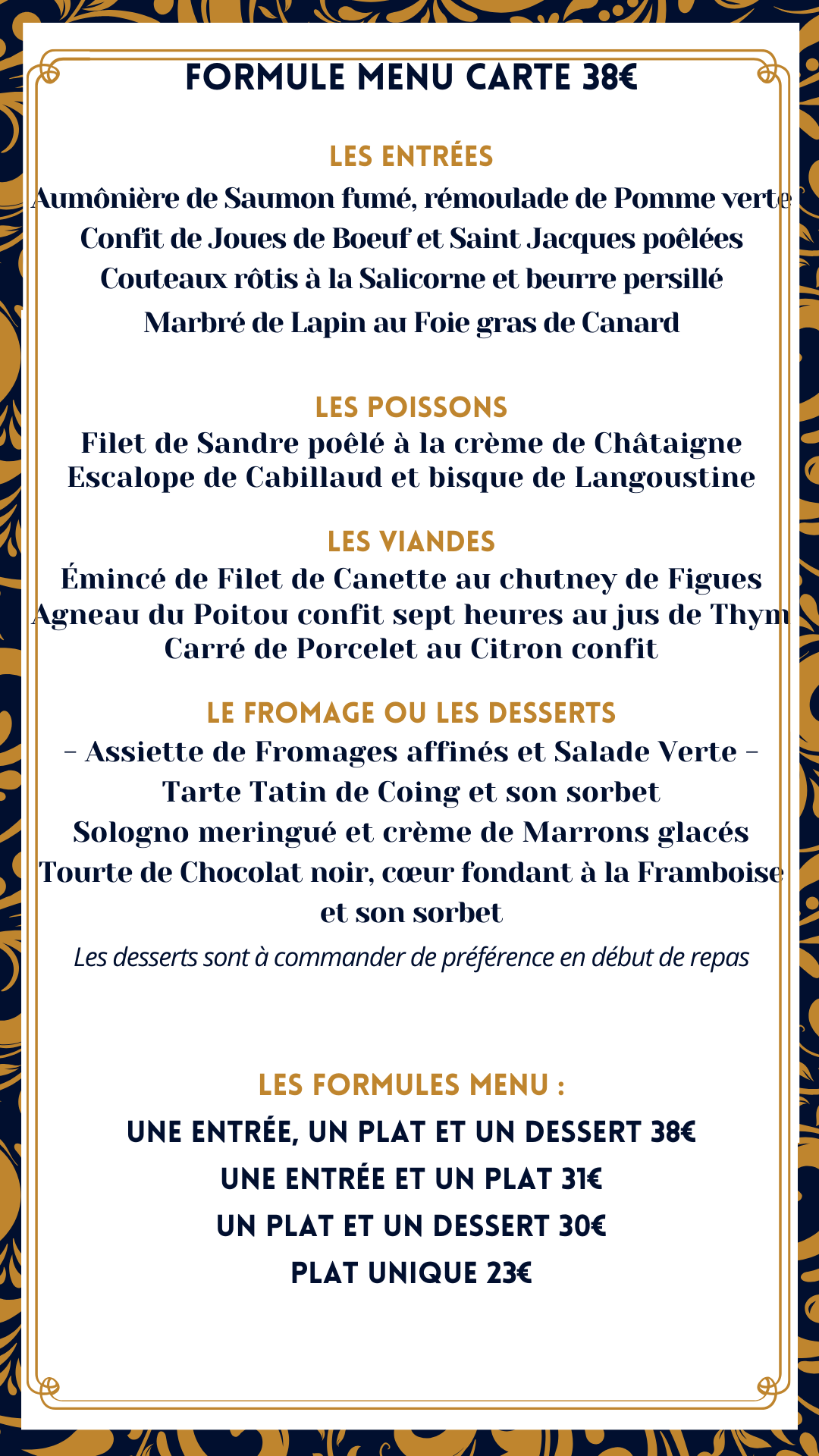 Nous vous proposons en plus de notre carte, chaque Midi, un choix entre un Poisson ou une viande suivie d'un dessert préparé par nos soins